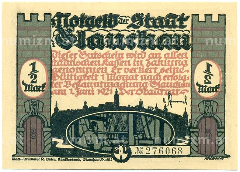 Банкнота 1/2 марки 1921 года Германия — Глаухау (Нотгельд) (Артикул: K10-12253): подробные характеристики, качественные фотографии в высоком разрешении, низкая цена.
