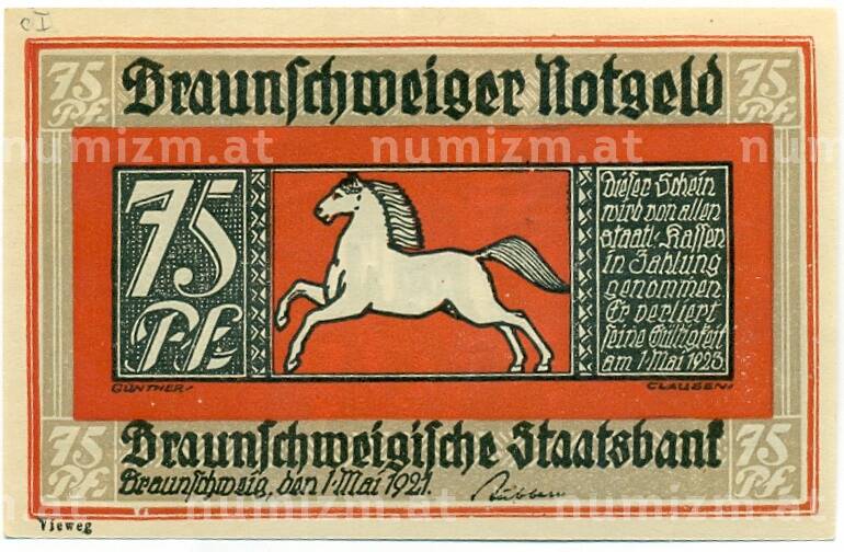 Банкнота 75 пфеннигов 1921 года Германия — Брауншвейг (Нотгельд) (Артикул: K10-12293): подробные характеристики, качественные фотографии в высоком разрешении, низкая цена.