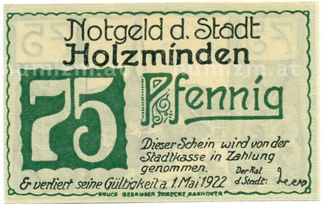 Банкнота 75 пфеннигов 1921 года Германия — Хольцминден (Нотгельд) (Артикул: K10-12297): подробные характеристики, качественные фотографии в высоком разрешении, низкая цена.