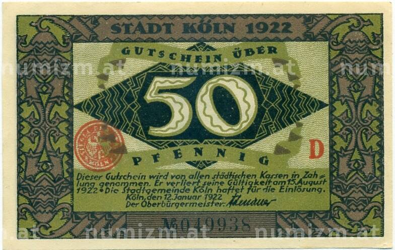 Купить 50 пфеннигов 1922 года Германия — Кельн (Нотгельд) по привлекательной цене можно в нашем интернет-магазине — Вам достаточно оформить заказ на сайте. Все монеты, представленные в каталоге, находятся в наличии на нашем складе.