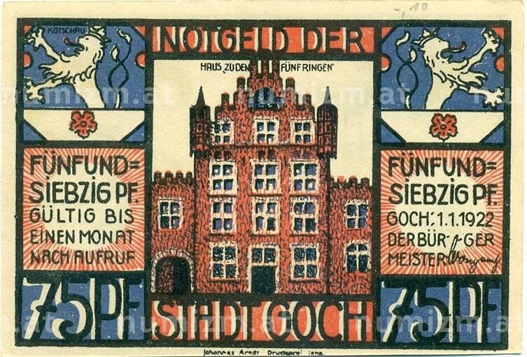Банкнота 75 пфеннигов 1922 года Германия — Гох (Нотгельд) (Артикул: K10-12318): подробные характеристики, качественные фотографии в высоком разрешении, низкая цена.