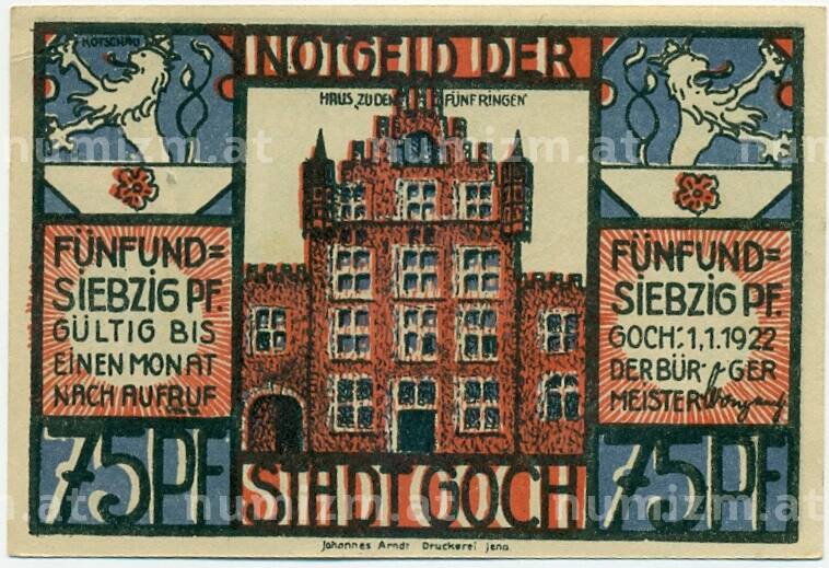 Купить 75 пфеннигов 1922 года Германия — Гох (Нотгельд) по привлекательной цене можно в нашем интернет-магазине — Вам достаточно оформить заказ на сайте. Все монеты, представленные в каталоге, находятся в наличии на нашем складе.