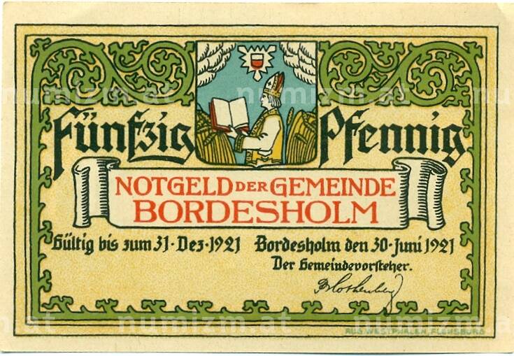Банкнота 50 пфеннигов 1921 года Германия — Бордесхольм (Нотгельд) (Артикул: K10-12322): подробные характеристики, качественные фотографии в высоком разрешении, низкая цена.