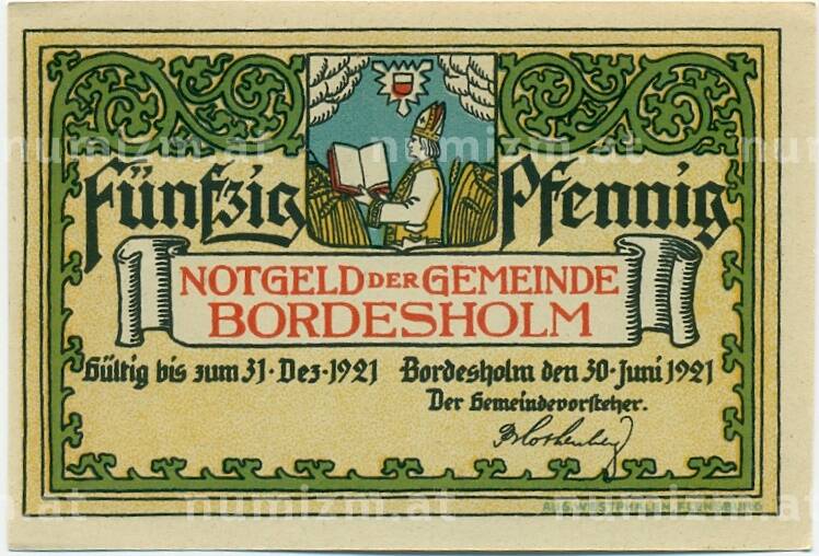 Банкнота 50 пфеннигов 1921 года Германия — Бордесхольм (Нотгельд) (Артикул: K10-12323): подробные характеристики, качественные фотографии в высоком разрешении, низкая цена.