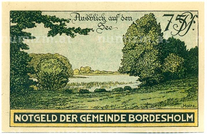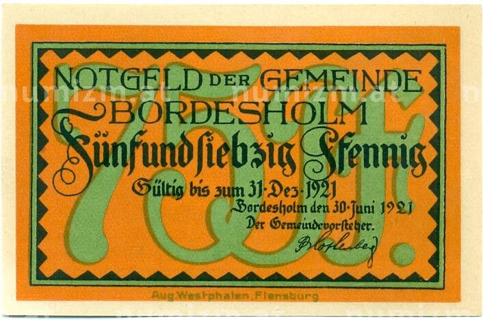 Банкнота 75 пфеннигов 1921 года Германия — Бордесхольм (Нотгельд) (Артикул: K10-12332): подробные характеристики, качественные фотографии в высоком разрешении, низкая цена.