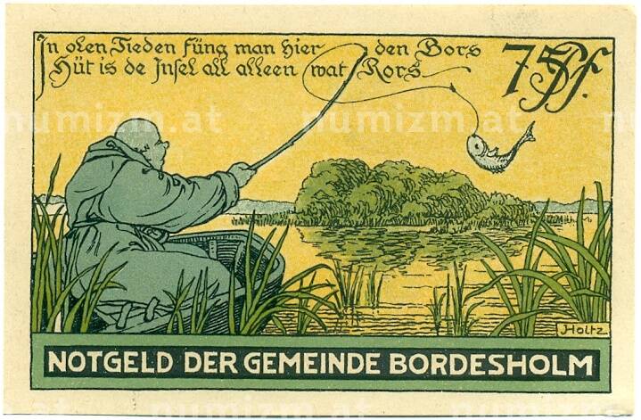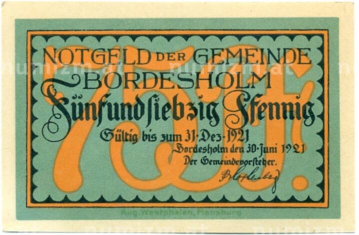 Банкнота 75 пфеннигов 1921 года Германия — Бордесхольм (Нотгельд) (Артикул: K10-12335): подробные характеристики, качественные фотографии в высоком разрешении, низкая цена.