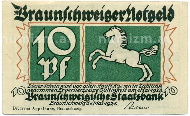 Банкнота 10 пфеннигов 1921 года Германия — Брауншвейг (Нотгельд) (Артикул: K10-12340): подробные характеристики, качественные фотографии в высоком разрешении, низкая цена.