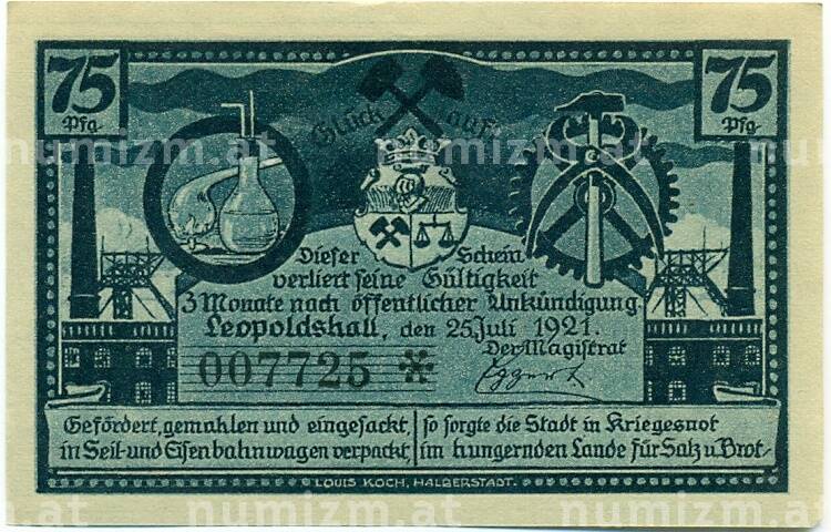 Купить 75 пфеннигов 1921 года Германия — Леопольдсхолл (Нотгельд) по привлекательной цене можно в нашем интернет-магазине — Вам достаточно оформить заказ на сайте. Все монеты, представленные в каталоге, находятся в наличии на нашем складе.