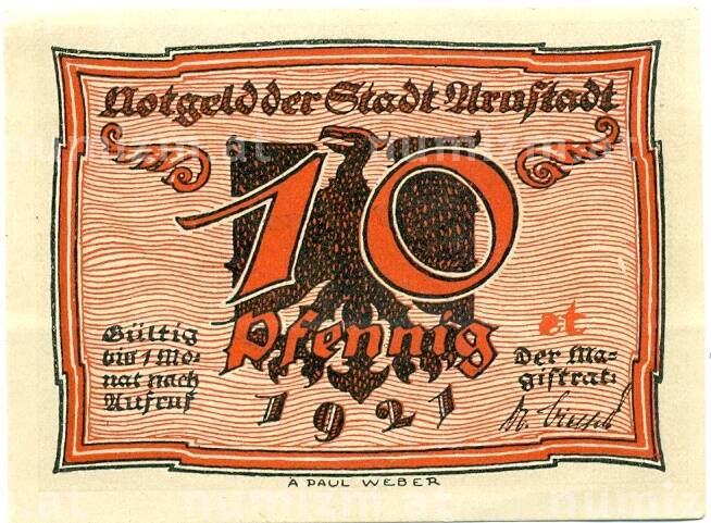 Банкнота 10 пфеннигов 1921 года Германия — Арнштадт (Нотгельд) (Артикул: K10-12368): подробные характеристики, качественные фотографии в высоком разрешении, низкая цена.