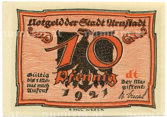 Банкнота 10 пфеннигов 1921 года Германия — Арнштадт (Нотгельд) (Артикул: K10-12371): подробные характеристики, качественные фотографии в высоком разрешении, низкая цена.