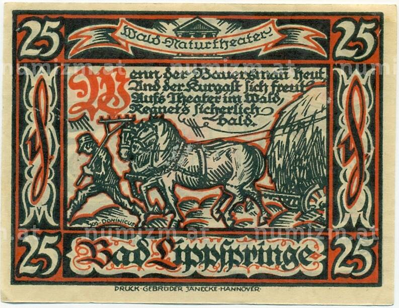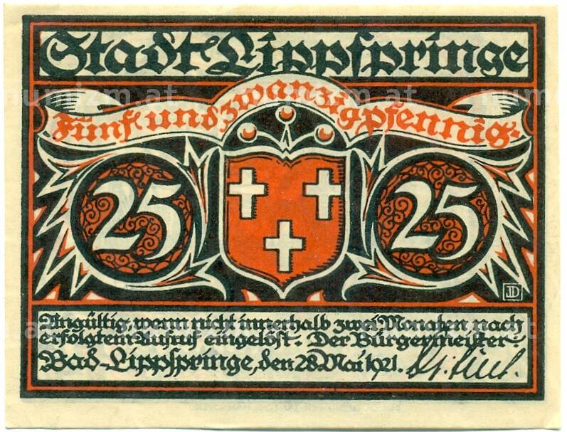 Банкнота 25 пфеннигов 1921 года Германия — Бад-Липпшпринге (Нотгельд) (Артикул: K10-12377): подробные характеристики, качественные фотографии в высоком разрешении, низкая цена.