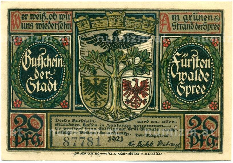 Купить 20 пфеннигов 1921 года Германия — Фюрстенвальде (Нотгельд) по привлекательной цене можно в нашем интернет-магазине — Вам достаточно оформить заказ на сайте. Все монеты, представленные в каталоге, находятся в наличии на нашем складе.