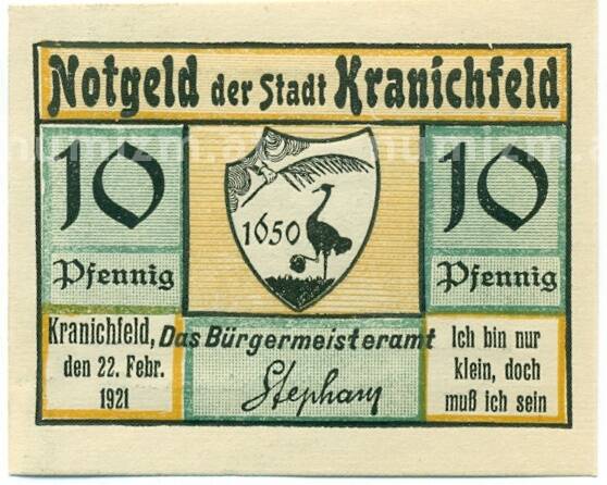 Купить 10 пфеннигов 1921 года Германия — Кранихфельд (Нотгельд) по привлекательной цене можно в нашем интернет-магазине — Вам достаточно оформить заказ на сайте. Все монеты, представленные в каталоге, находятся в наличии на нашем складе.