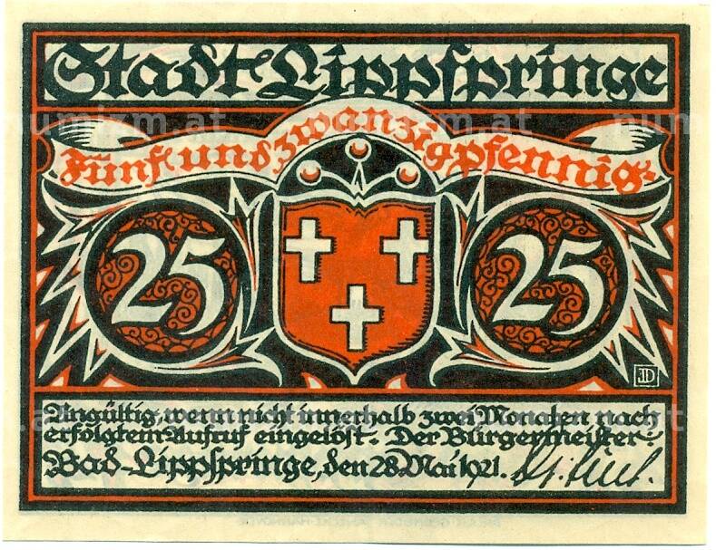 Купить 25 пфеннигов 1921 года Германия — Бад-Липпшпринге (Нотгельд) по привлекательной цене можно в нашем интернет-магазине — Вам достаточно оформить заказ на сайте. Все монеты, представленные в каталоге, находятся в наличии на нашем складе.