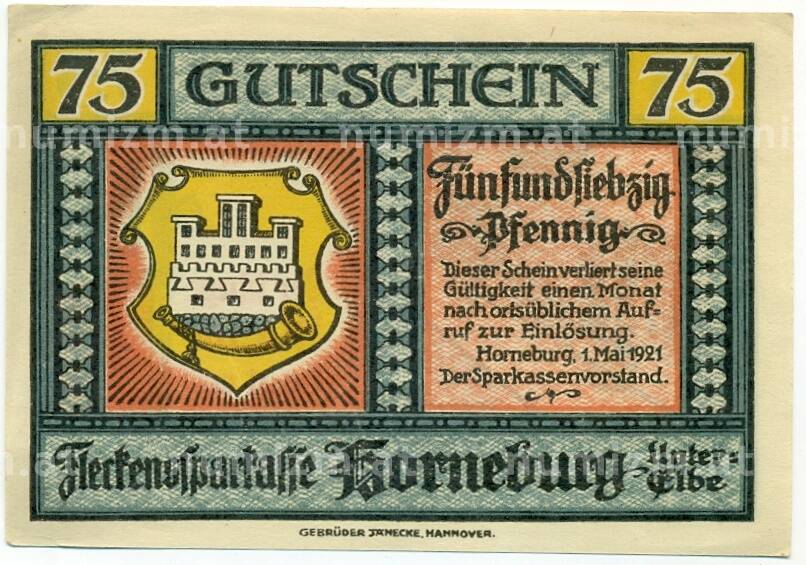 Купить 75 пфеннигов 1921 года Германия — Хорнебург (Нотгельд) по привлекательной цене можно в нашем интернет-магазине — Вам достаточно оформить заказ на сайте. Все монеты, представленные в каталоге, находятся в наличии на нашем складе.