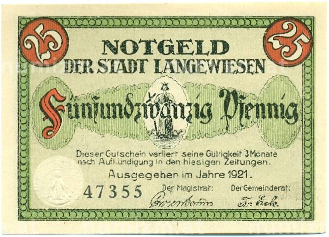 Купить 25 пфеннигов 1921 года Германия — Лангевизен (Нотгельд) по привлекательной цене можно в нашем интернет-магазине — Вам достаточно оформить заказ на сайте. Все монеты, представленные в каталоге, находятся в наличии на нашем складе.