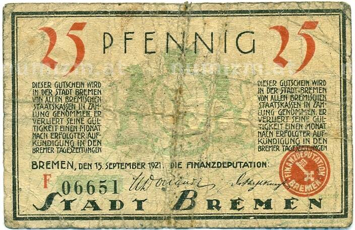 Купить 25 пфеннигов 1921 года Германия — Бремен (Нотгельд) по привлекательной цене можно в нашем интернет-магазине — Вам достаточно оформить заказ на сайте. Все монеты, представленные в каталоге, находятся в наличии на нашем складе.