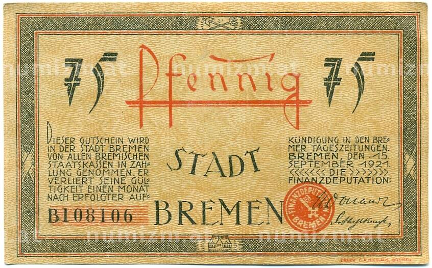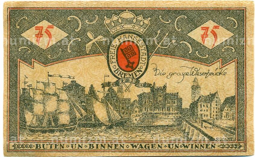 Купить 75 пфеннигов 1921 года Германия — Бремен (Нотгельд) по привлекательной цене можно в нашем интернет-магазине — Вам достаточно оформить заказ на сайте. Все монеты, представленные в каталоге, находятся в наличии на нашем складе.
