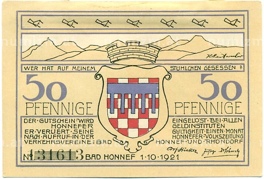 Купить 50 пфеннигов 1921 года Германия — Бад-Хоннеф (Нотгельд) по привлекательной цене можно в нашем интернет-магазине — Вам достаточно оформить заказ на сайте. Все монеты, представленные в каталоге, находятся в наличии на нашем складе.