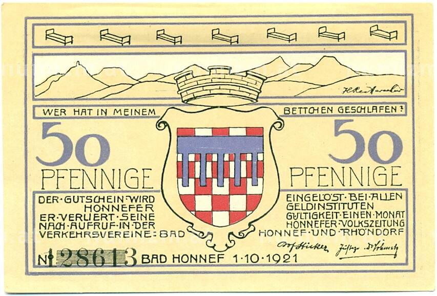 Банкнота 50 пфеннигов 1921 года Германия — Бад-Хоннеф (Нотгельд) (Артикул: K10-12485): подробные характеристики, качественные фотографии в высоком разрешении, низкая цена.