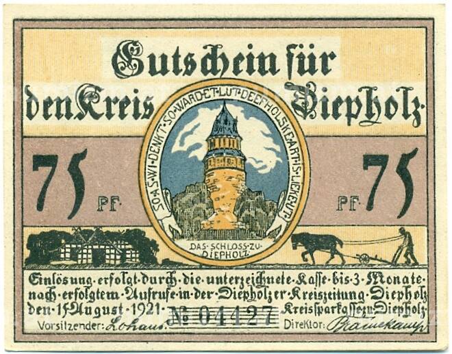 Купить 75 пфеннигов 1921 года Германия — Дипхольц (Нотгельд) по привлекательной цене можно в нашем интернет-магазине — Вам достаточно оформить заказ на сайте. Все монеты, представленные в каталоге, находятся в наличии на нашем складе.