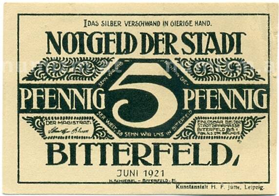 Банкнота 5 пфеннигов 1921 года Германия — Биттерфельд (Нотгельд) (Артикул: K10-12528): подробные характеристики, качественные фотографии в высоком разрешении, низкая цена.