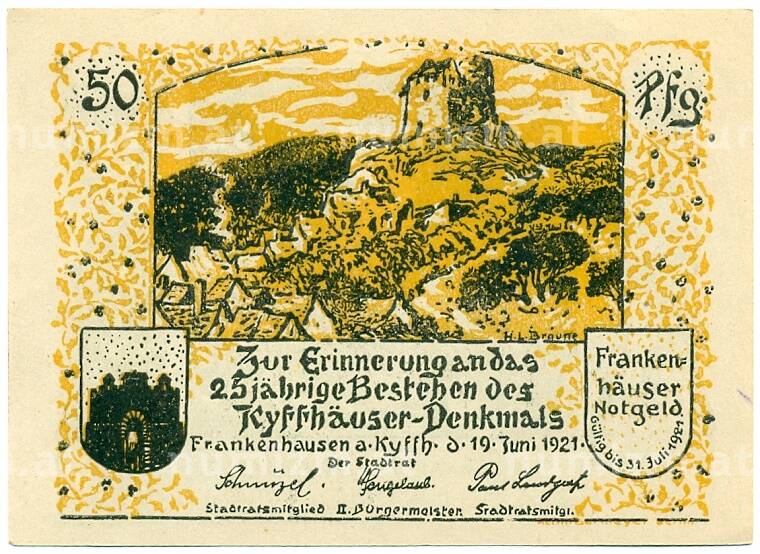 Банкнота 50 пфеннигов 1921 года Германия — Франкенхаузен (Нотгельд) (Артикул: K10-12537): подробные характеристики, качественные фотографии в высоком разрешении, низкая цена.