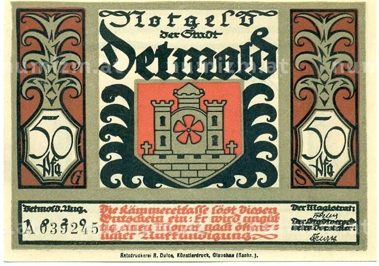 Банкнота 50 пфеннигов 1921 года Германия — Детмольд (Нотгельд) (Артикул: K10-12556): подробные характеристики, качественные фотографии в высоком разрешении, низкая цена.