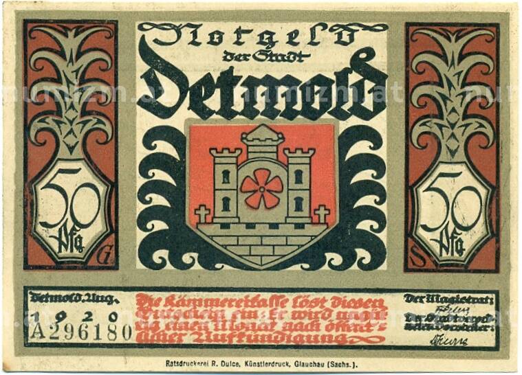 Банкнота 50 пфеннигов 1921 года Германия — Детмольд (Нотгельд) (Артикул: K10-12557): подробные характеристики, качественные фотографии в высоком разрешении, низкая цена.