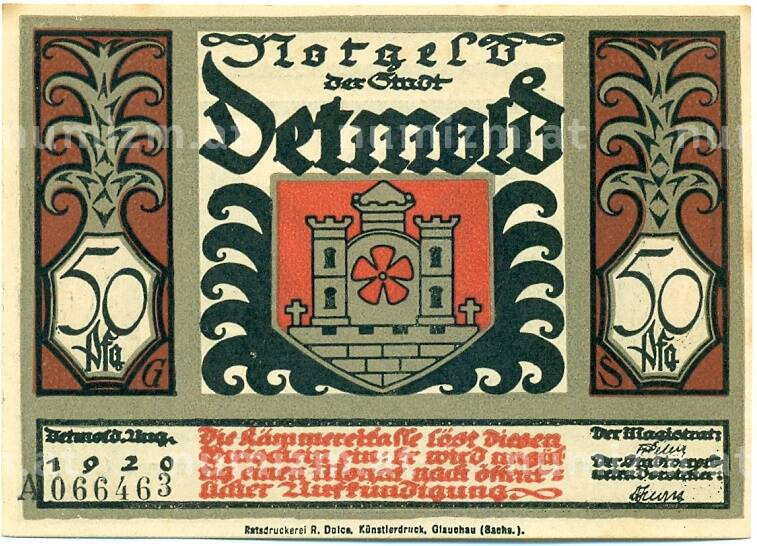 Банкнота 50 пфеннигов 1921 года Германия — Детмольд (Нотгельд) (Артикул: K10-12559): подробные характеристики, качественные фотографии в высоком разрешении, низкая цена.