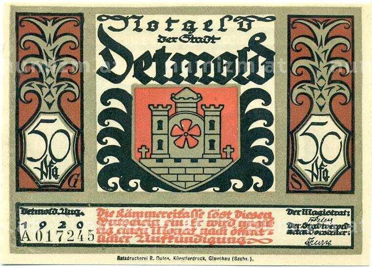 Банкнота 50 пфеннигов 1921 года Германия — Детмольд (Нотгельд) (Артикул: K10-12560): подробные характеристики, качественные фотографии в высоком разрешении, низкая цена.