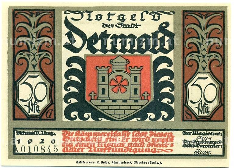 Банкнота 50 пфеннигов 1921 года Германия — Детмольд (Нотгельд) (Артикул: K10-12563): подробные характеристики, качественные фотографии в высоком разрешении, низкая цена.