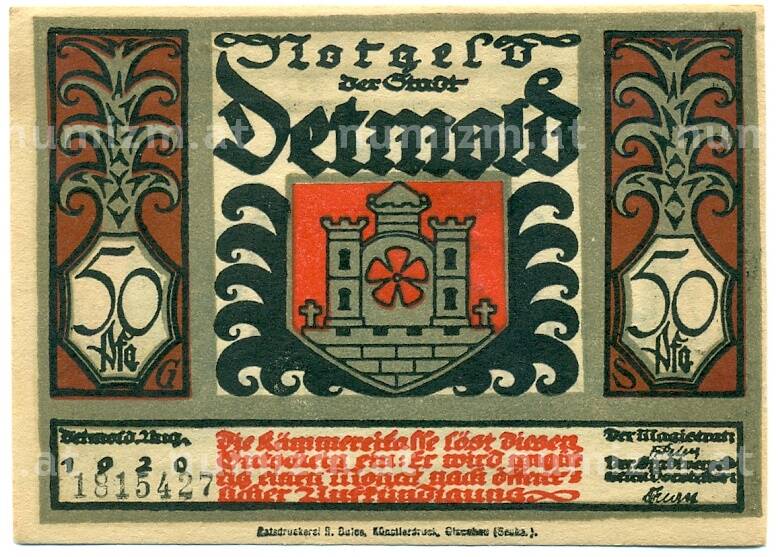 Банкнота 50 пфеннигов 1921 года Германия — Детмольд (Нотгельд) (Артикул: K10-12567): подробные характеристики, качественные фотографии в высоком разрешении, низкая цена.