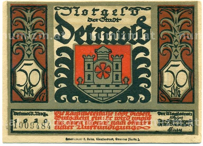 Банкнота 50 пфеннигов 1921 года Германия — Детмольд (Нотгельд) (Артикул: K10-12568): подробные характеристики, качественные фотографии в высоком разрешении, низкая цена.