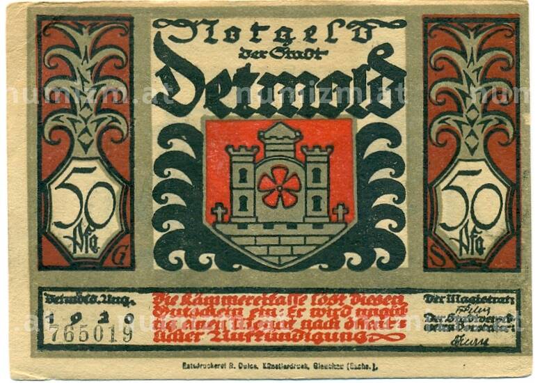 Банкнота 50 пфеннигов 1921 года Германия — Детмольд (Нотгельд) (Артикул: K10-12571): подробные характеристики, качественные фотографии в высоком разрешении, низкая цена.
