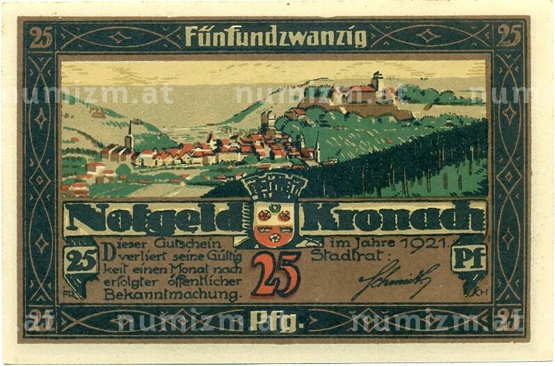 Банкнота 25 пфеннигов 1921 года Германия — Кронах (Нотгельд) (Артикул: K10-12574): подробные характеристики, качественные фотографии в высоком разрешении, низкая цена.