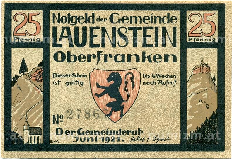 Банкнота 25 пфеннигов 1921 года Германия — Лауэнштайн (Нотгельд) (Артикул: K10-12577): подробные характеристики, качественные фотографии в высоком разрешении, низкая цена.