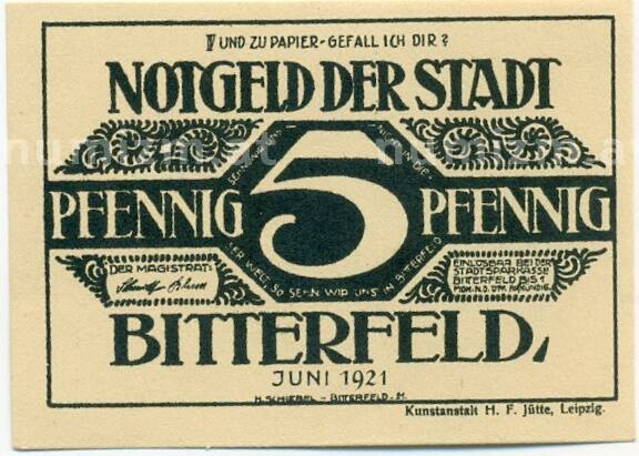 Банкнота 5 пфеннигов 1921 года Германия — Биттерфельд (Нотгельд) (Артикул: K10-12585): подробные характеристики, качественные фотографии в высоком разрешении, низкая цена.