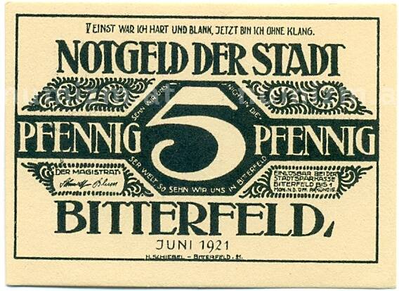Банкнота 5 пфеннигов 1921 года Германия — Биттерфельд (Нотгельд) (Артикул: K10-12586): подробные характеристики, качественные фотографии в высоком разрешении, низкая цена.