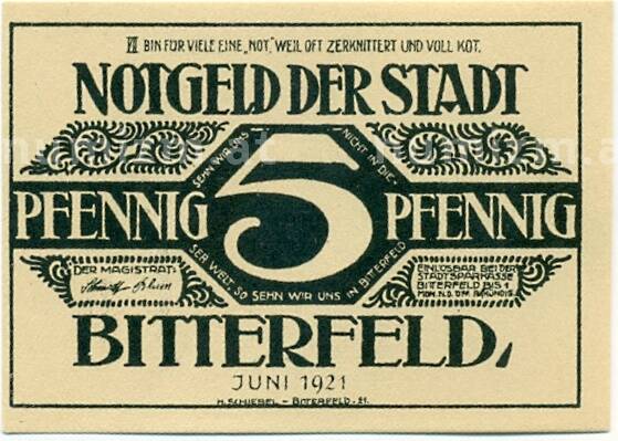 Банкнота 5 пфеннигов 1921 года Германия — Биттерфельд (Нотгельд) (Артикул: K10-12588): подробные характеристики, качественные фотографии в высоком разрешении, низкая цена.