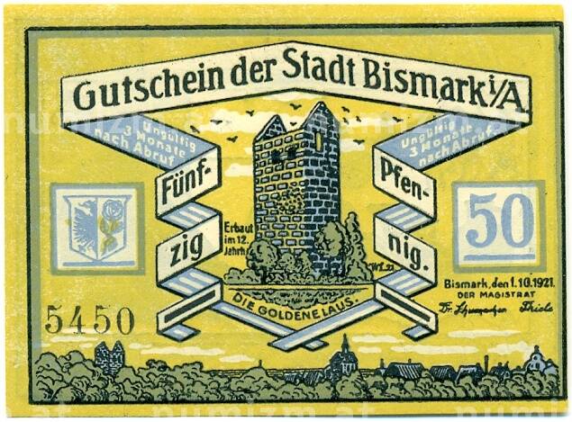 Банкнота 50 пфеннигов 1921 года Германия — Бисмарк (Нотгельд) (Артикул: K10-12595): подробные характеристики, качественные фотографии в высоком разрешении, низкая цена.