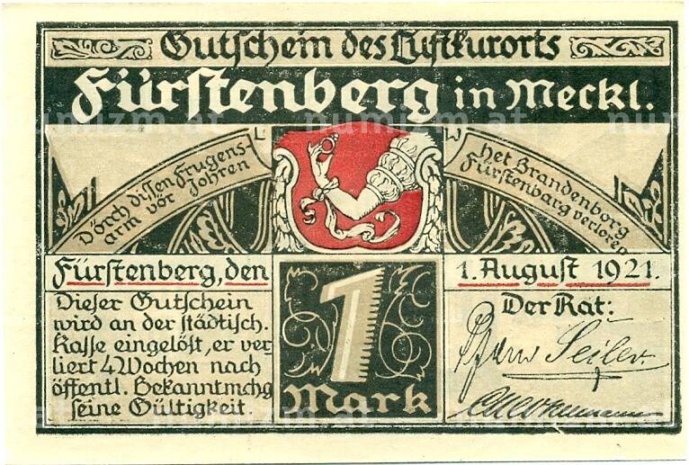 Банкнота 1 марка 1921 года Германия — Фюрстенберг (Нотгельд) (Артикул: K10-12602): подробные характеристики, качественные фотографии в высоком разрешении, низкая цена.