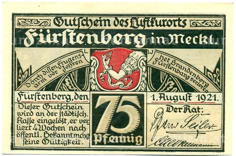 Банкнота 75 пфеннигов 1921 года Германия — Фюрстенберг (Нотгельд) (Артикул: K10-12603): подробные характеристики, качественные фотографии в высоком разрешении, низкая цена.