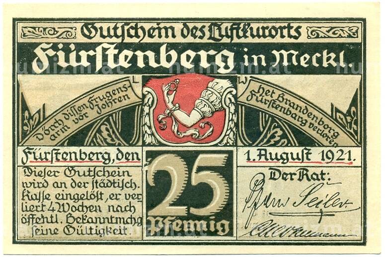 Интернет магазин «Нумизмат» предлагает приобрести 25 пфеннигов 1921 года Германия — Фюрстенберг (Нотгельд).