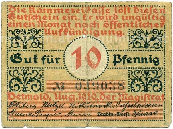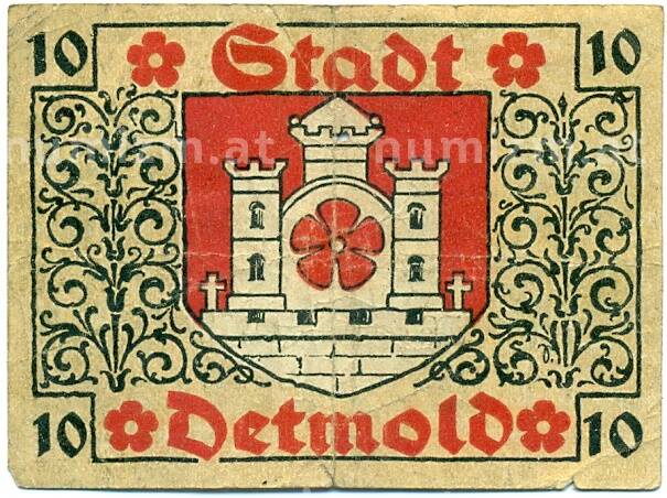 Банкнота 10 пфеннигов 1920 года Германия — Детмольд (Нотгельд) (Артикул: K10-12616): подробные характеристики, качественные фотографии в высоком разрешении, низкая цена.