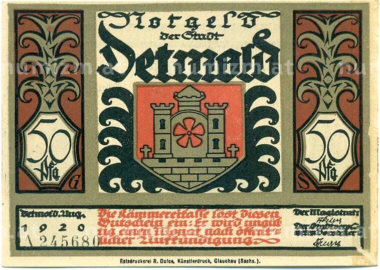 Банкнота 50 пфеннигов 1921 года Германия — Детмольд (Нотгельд) (Артикул: K10-12624): подробные характеристики, качественные фотографии в высоком разрешении, низкая цена.