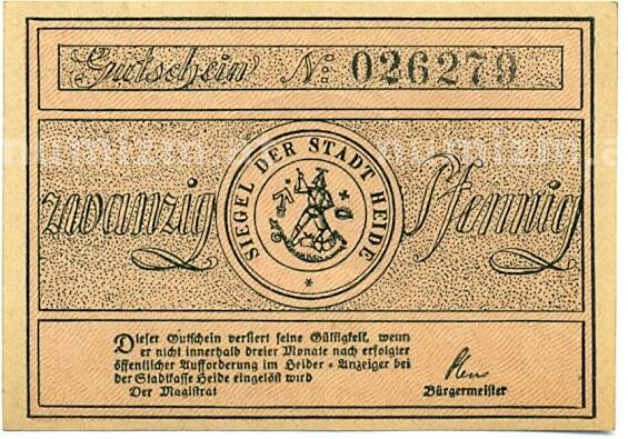 Банкнота 20 пфеннигов 1921 года Германия — Хайде (Нотгельд) (Артикул: K10-12632): подробные характеристики, качественные фотографии в высоком разрешении, низкая цена.