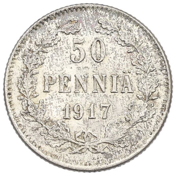 Монета 50 пенни 1917 года Русская Финляндия — Орел без корон (Временное правительство) (Артикул: K10-1266): подробные характеристики, качественные фотографии в высоком разрешении, низкая цена.