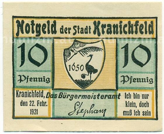 Банкнота 10 пфеннигов 1921 года Германия — Кранихфельд (Нотгельд) (Артикул: K10-12689): подробные характеристики, качественные фотографии в высоком разрешении, низкая цена.