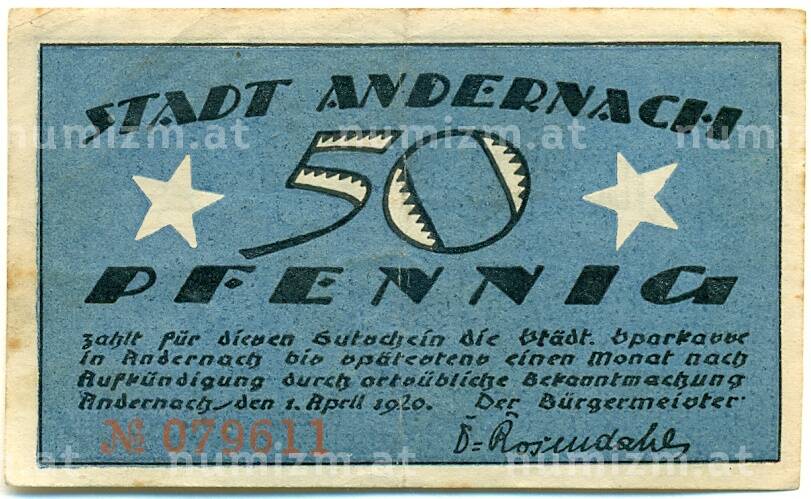 Купить 50 пфеннигов 1920 года Германия — Андернах (Нотгельд) по привлекательной цене можно в нашем интернет-магазине — Вам достаточно оформить заказ на сайте. Все монеты, представленные в каталоге, находятся в наличии на нашем складе.